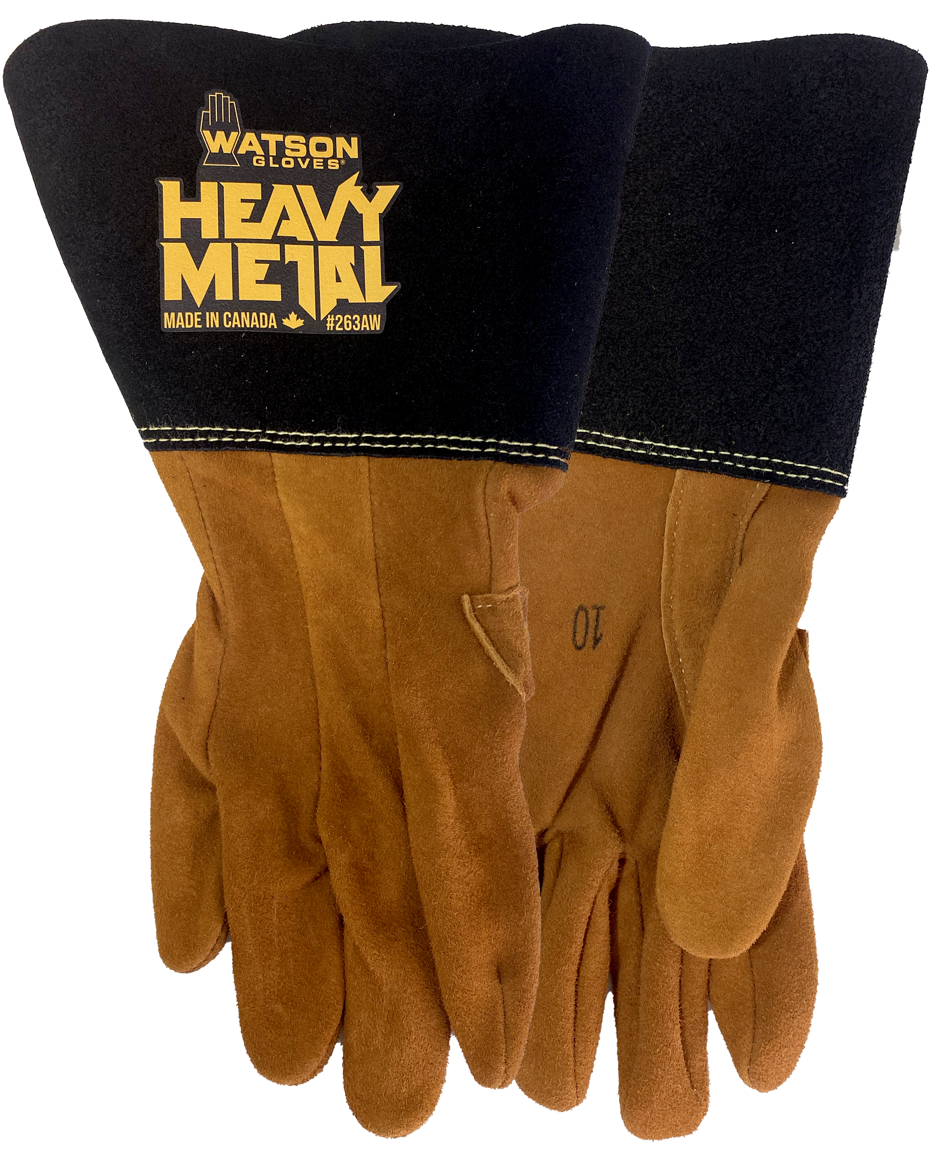 Split deerskin leather, clute cut design with straight thumb, leather reinforced thumb saddle, stitched with Kevlar® thread, gauntlet style cuff with leather gore, unlined, made in Canada. Size 7–14