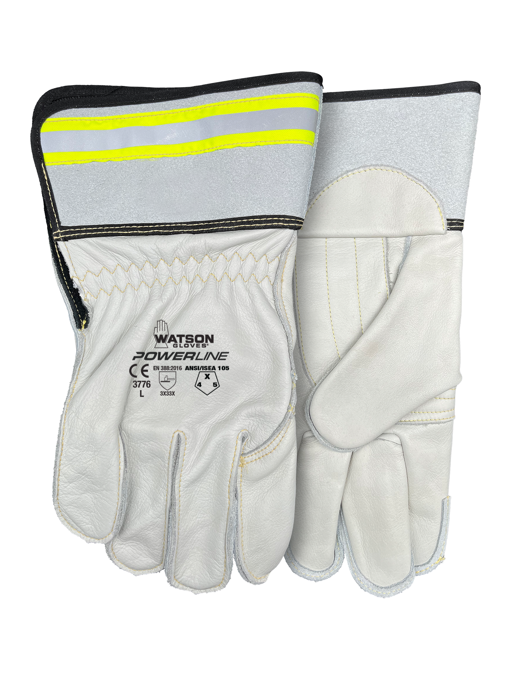 Full-grain cowhide stitched with Kevlar® thread, pulse protector, extra wide thumb strap, 3-finger back with winged thumb, snug-fitting shirred elastic wrist with a 3” reflective cuff, leather gore with binding trim. Size M–XL