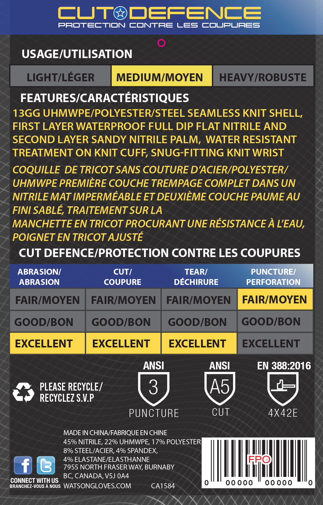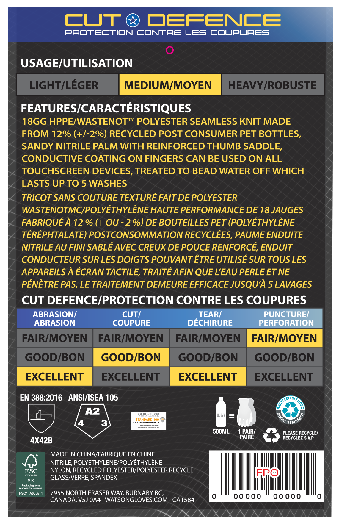 13gg HPPE/glass/steel/ WasteNot™ polyester seamless knit made from recycled post consumer PET bottles, first layer waterproof full dip flat nitrile and second layer sandy nitrile palm, water resistant treatment lasts up to five washes, snug-fitting knit wrist. Size S–XXL. *One - 500mL recycled plastic bottle is used to make one pair of gloves