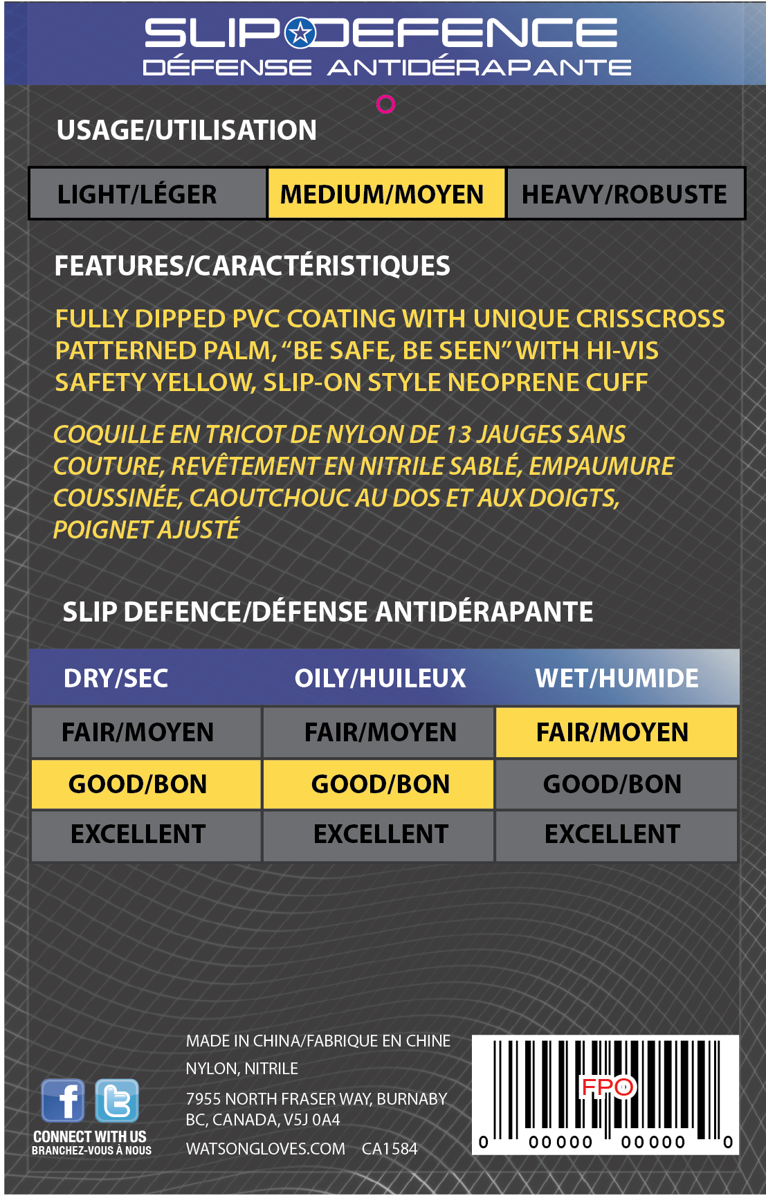 Microfoam nitrile coating with nitrile dotted palm, 15gg fine nylon shell, ergonomically formed, snug-fitting seamless knit wrist. Size S–XXL