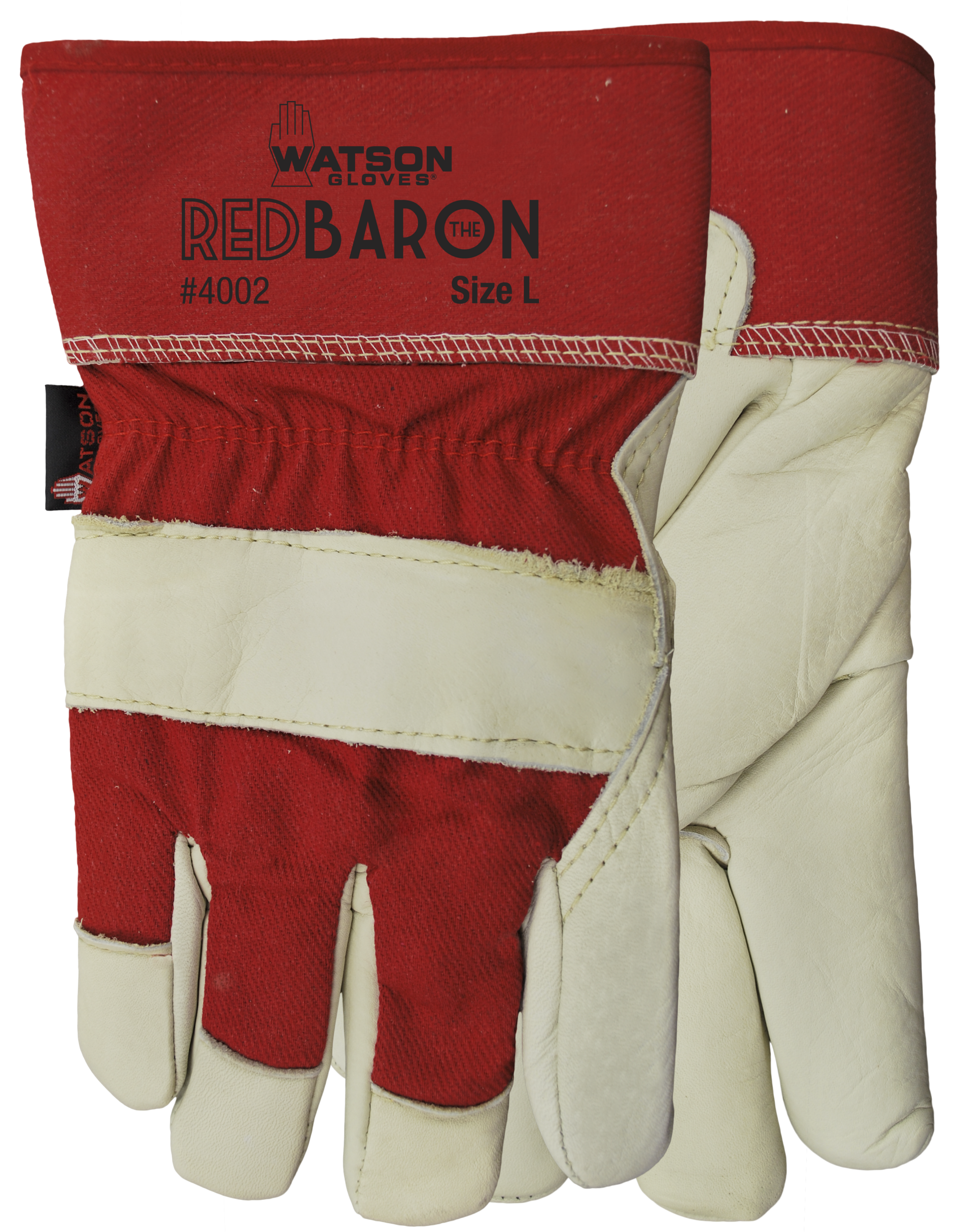 Premium full-grain cowhide leather, cotton drill back, shirred elastic wrist, slip-on style safety cuff, unlined. 94002 Heavy Sherpa Lining. 94002XXS Baby Baron (Kids). Size S–XXL
