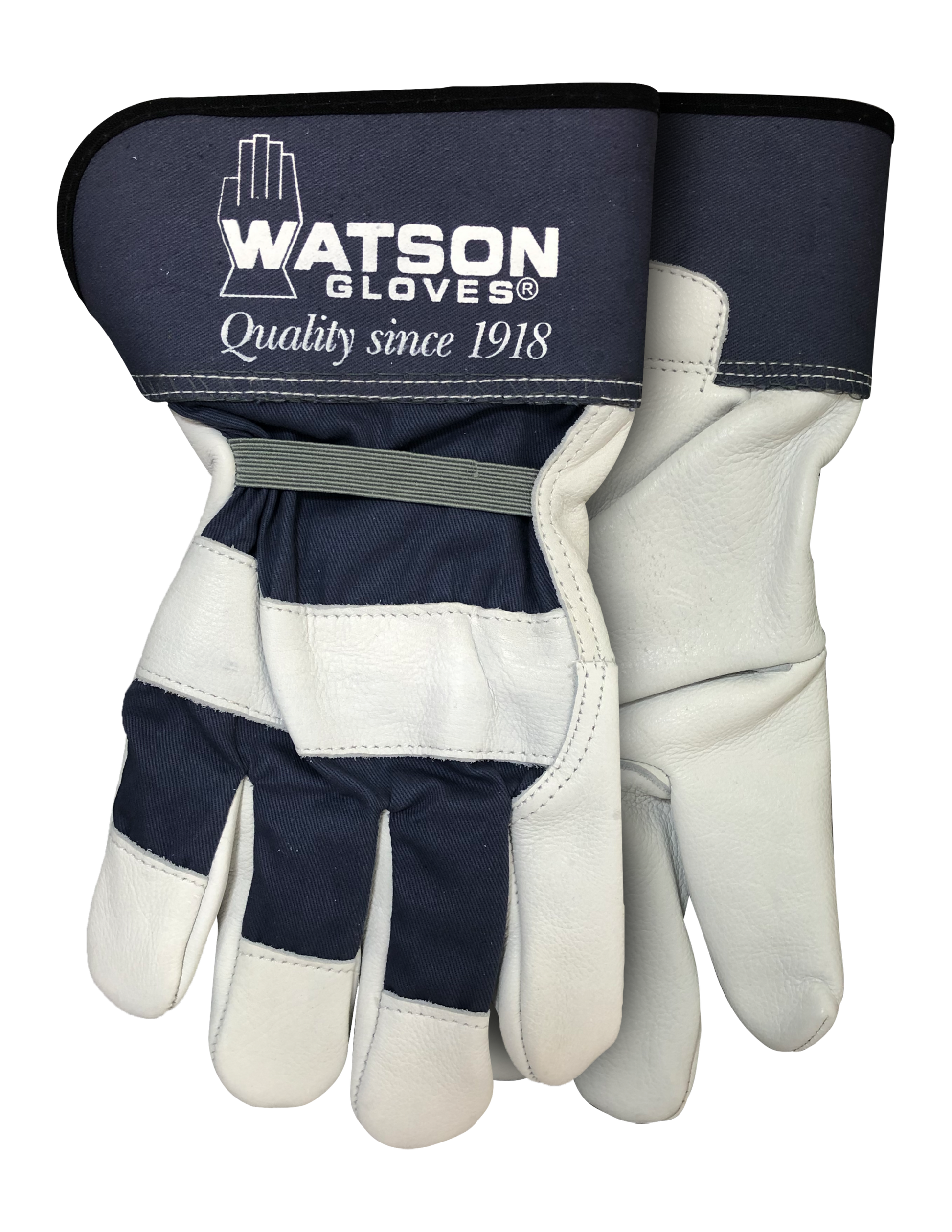Full-grain buffalo leather, cotton drill back, outside elastic wrist, slip-on style safety cuff. Size OS