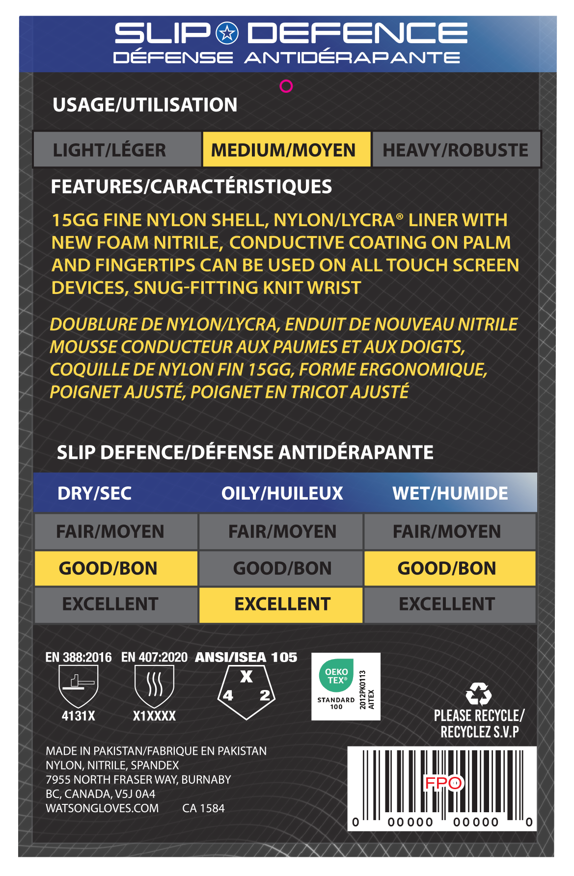 15gg fine nylon shell, nylon/Lycra® liner with New Foam Nitrile conductive coating on palm and fingertips can be used on all touch screen devices, snug-fitting seamless knit wrist. Size XS–XL