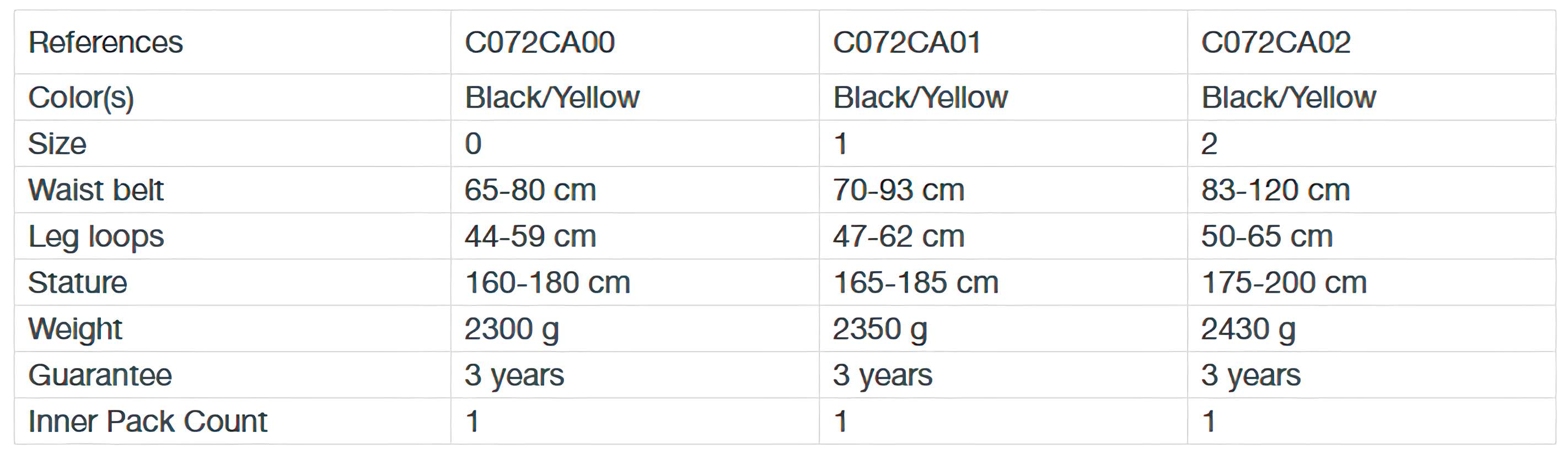 - Waistbelt and leg loops equipped with FAST LT PLUS buckles for quick and easy fastening and unfastening without loss of adjustment, even while wearing gloves; these buckles allow the harness to be donned very easily, with both feet on the ground