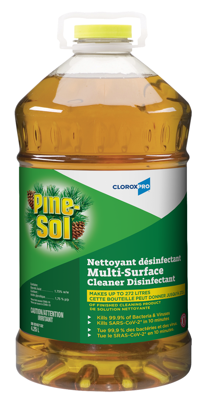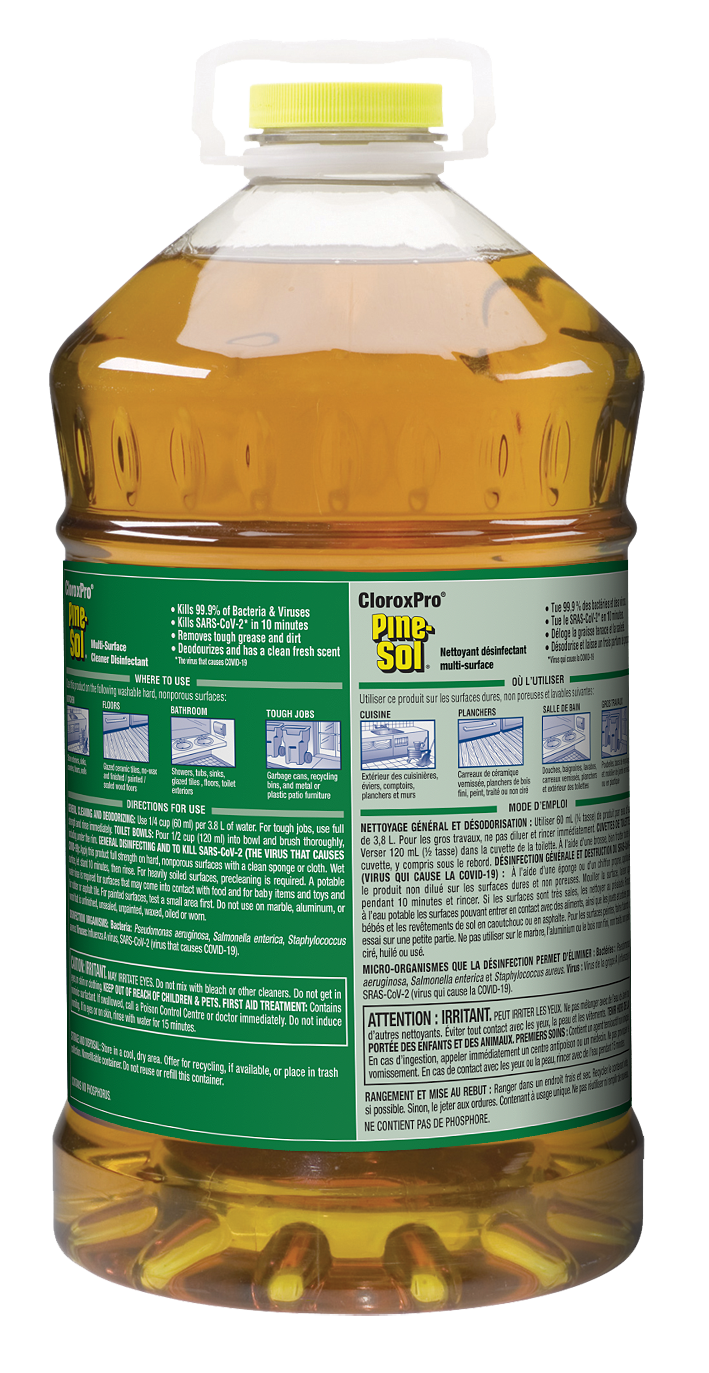 Pine-Sol® Multi-Surface Cleaner is a Health Canada-registered disinfectant that kills household bacteria and viruses on hard surfaces. With its superior grease-cutting capabilities, it effectively removes tough dirt and grime that competitors leave behind. Plus, Pine-Sol® has the highest scent scores, conveying a sense of cleanliness to all who use it. You'll also get more for your money, as you only need half as much Pine-Sol® as competitor products to make a gallon of cleaning solution.