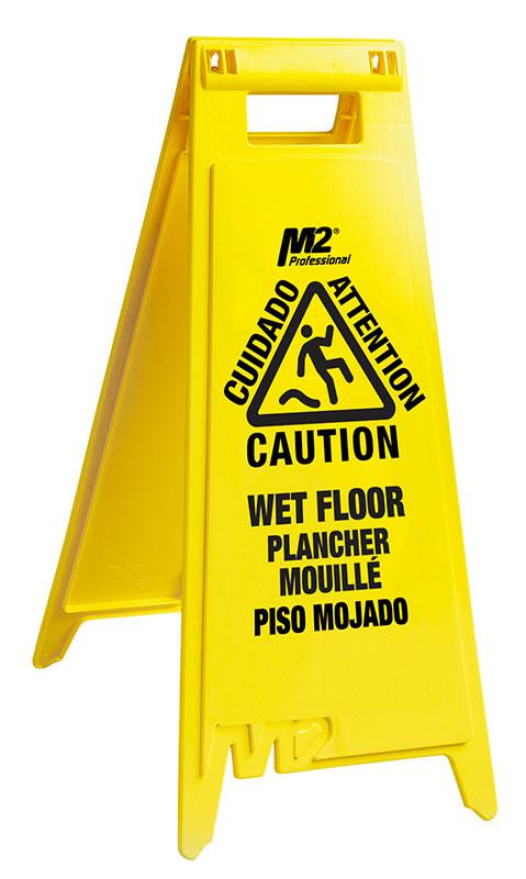 This 2-sided bright yellow wet floor sign is printed with "CAUTION Wet Floor" in both English and French, so everyone can clearly see, read, and avoid the area. The hinge system and taller design makes them stronger, preventing them from flattening out. The 4-point stance prevents them from leaving marks on finished floors.